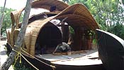 oarsmen, a cook and a local guide. Showcasing a unique heritage The kettuvalloms (houseboats) of Kerala are giant country crafts, measuring up to 120 feet in length. It took great skill and meticulousness to construct these giants by tying huge planks of jack wood /Anjili Wood together, without the use of a single nail. |